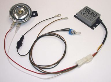 Da die Elektronik in moderner C-MOS-Technologie aufgebaut ist, benötigt sie nur eine minimale Leerlaufstromaufnahme (3 mA). Dies bringt den Vorteil mit sich, daß Sie das Gerät praktisch beliebig lange eingeschaltet lassen können. Sie müssen nicht befürchten, daß Ihr Motorrad nach längerer Standzeit (4 Wochen und mehr) wegen der ‘scharf' gemachten Anlage nicht mehr starten würde. Das Einschalten der Anlage geschieht standardmäßig über den mitgelieferten Minischalter, der an versteckter Stelle (z.B.: unter der Sitzbank) montiert wird. Statt des Minischalters kann selbstverständlich auch ein Schlüsselschalter  verwendet werden (Aufpreis!). Eine Einschaltverzögerung von ca. 20 Sekunden garantiert die problemlose Inbetriebnahme des Geräts. MICRO besitzt einen fertigen Kabelbaum, dessen vorbereitete Kabelenden Sie nur noch mit dem Minus- und Pluspol Ihrer 12V-Motorrad-Batterie und mit der mitgelieferten Hupe verbinden müssen. Weitere Verdrahtungsarbeiten finden nicht statt, so daß der Geräteeinbau auch durch Laien binnen kürzester Zeit zu bewerkstelligen ist.  |